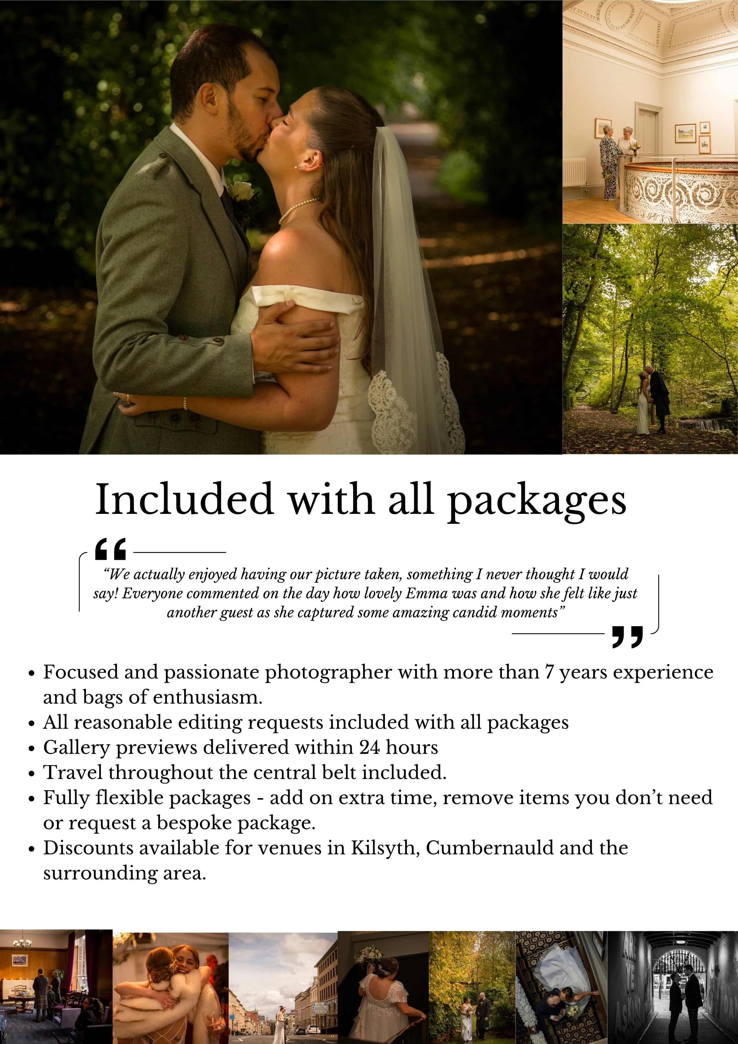 All wedding bookings include face to face consultations, venue visits and unlimited editing at no additional charge.